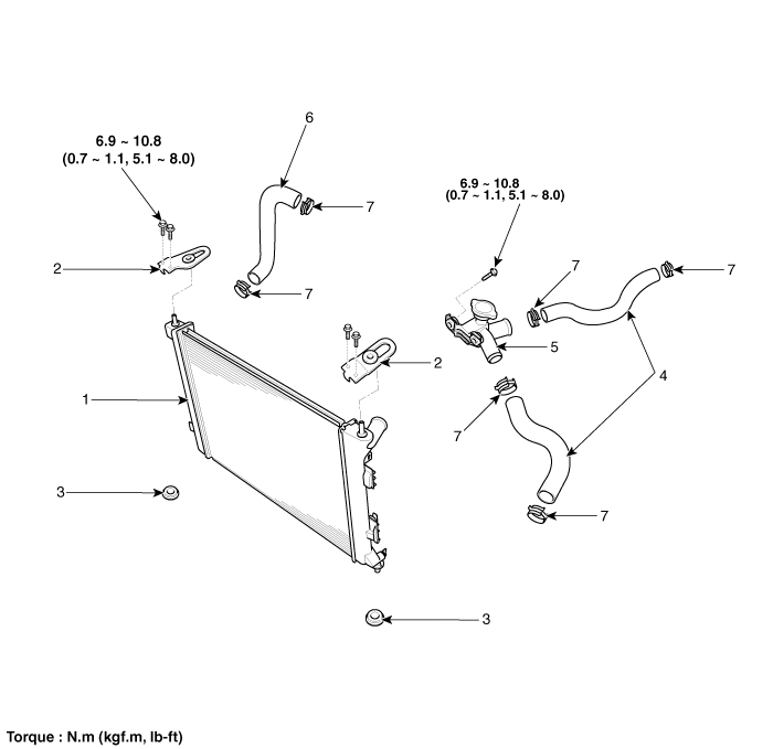 5. Filler neck assembly 6. Radiator lower hose 7. Clamp |